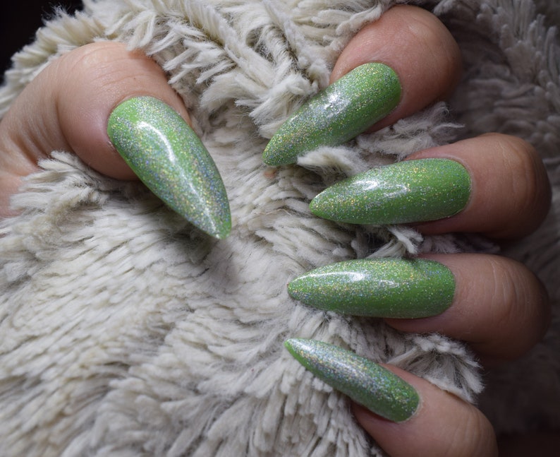 Holographic Green Fake Nails Extra Long Stiletto False Nails Etsy