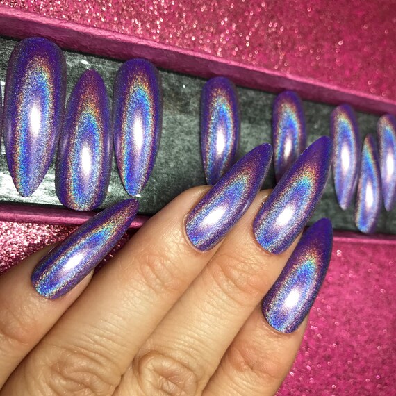 Luxury Hand Painted False Nails Long Stiletto Holographic Etsy